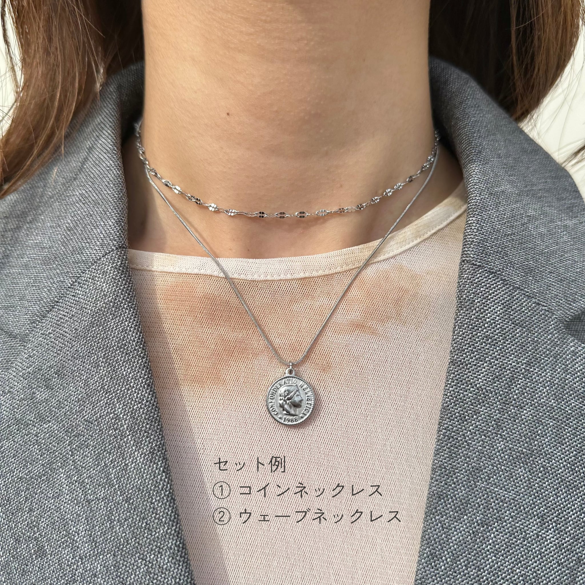 重ね付けも単品使いもできる、ネックレス2本セットです。
