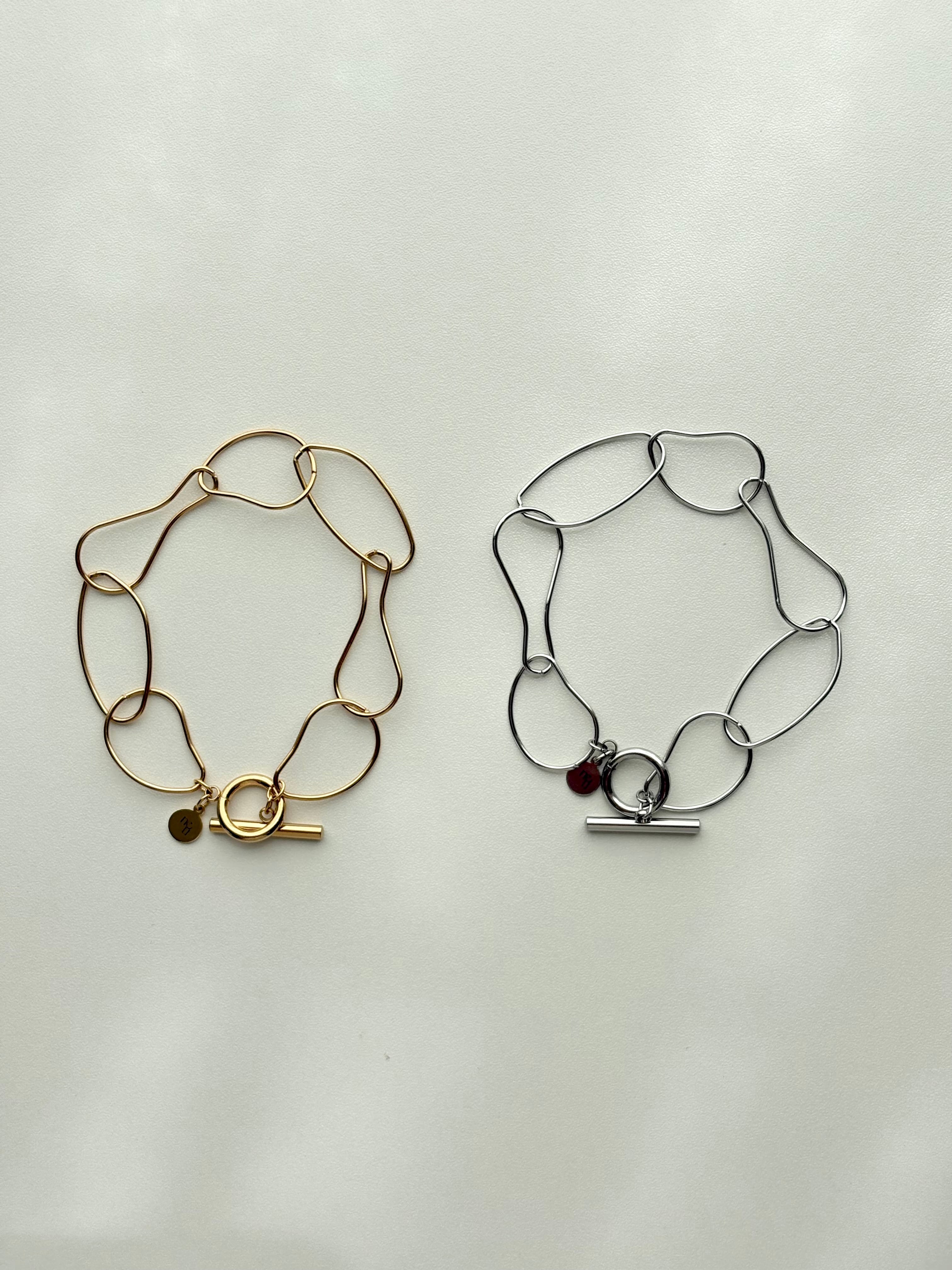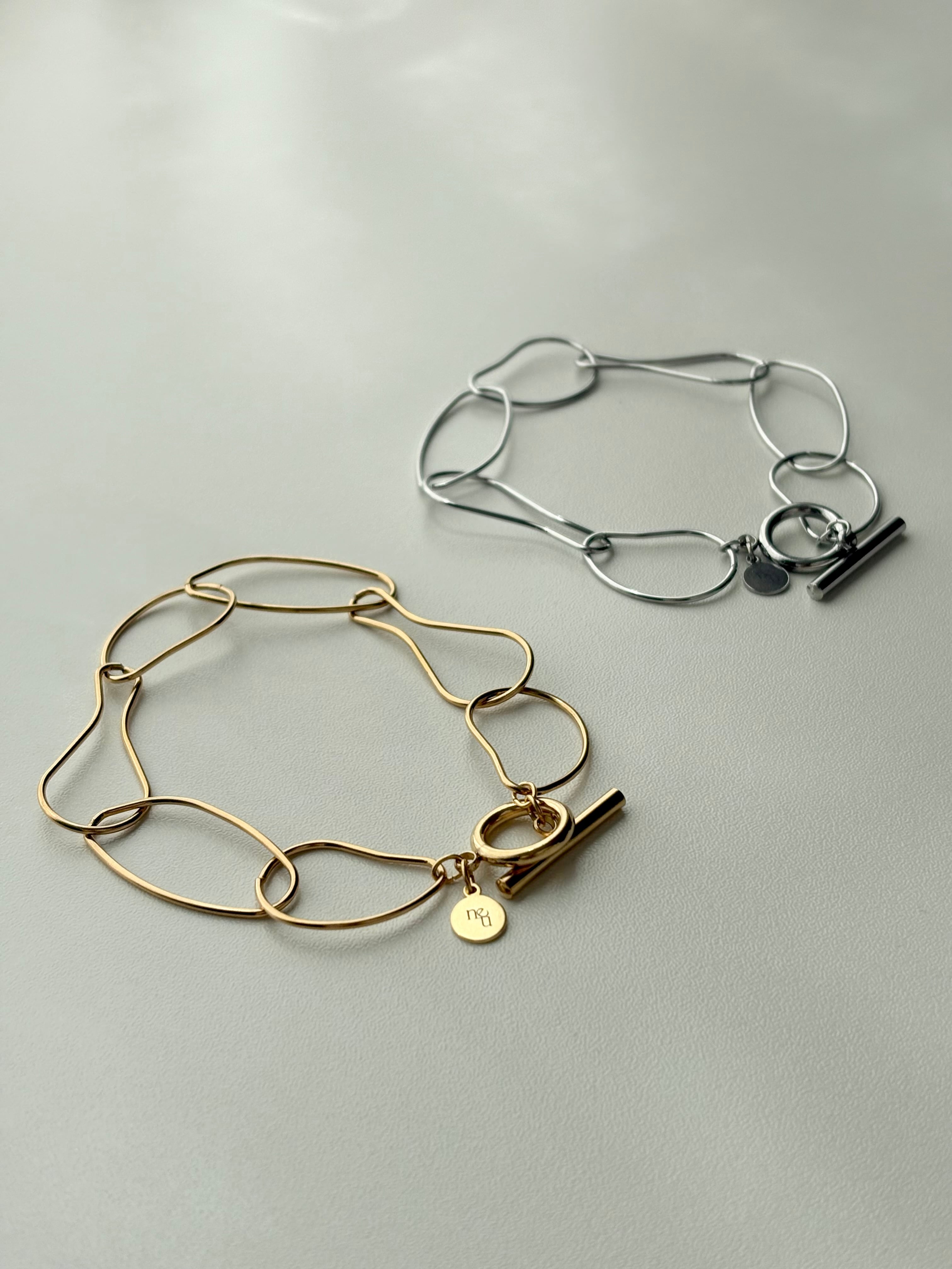 歪んだ楕円形チェーンが涼しさを感じさせるシルバーのブレスレット。水のように流れるデザインが夏と冬の美しさを手元に閉じ込めます。