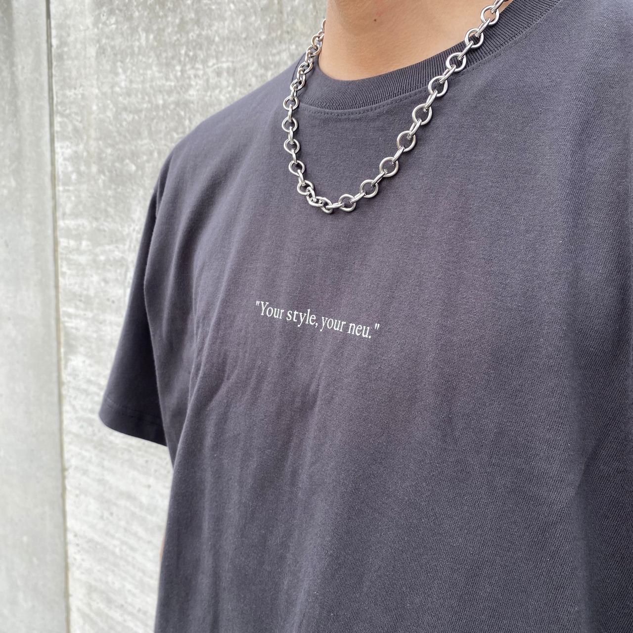 neuはシンプルかつジェンダーレスでメッセージ性のあるアクセサリーを通じてお客さまと繋がることを大切にしています。このTシャツにはそんなneuの想いをデザインとして込めました。またジェンダーレスに着ていただけるようシンプルなデザインでややオーバーサイズのTシャツに仕上げました。